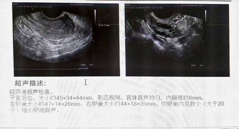 注释:双卵巢内见数个(大于20个)细小卵泡回声