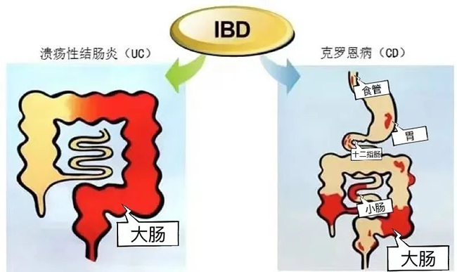 炎症性肠病(简称IBD)是一种主要累及胃肠道的慢性炎症性疾病,原因是胃肠道粘膜“无缘无故“地发生炎症(专业说法叫非特异性炎症)。炎症可能位于胃肠道的一部分,例如在大肠,也可能出现在消化道的任何部分,从口腔到肛门。炎症性肠病包括两种常见类型,分别叫做克罗恩病(CD)和溃疡性结肠炎(UC)。还有一小部分患者呈现出克罗恩病和溃疡性结肠炎的双重特征,难以区分为克罗恩病或溃疡性结肠炎,这种我们称之为未定型结肠炎。