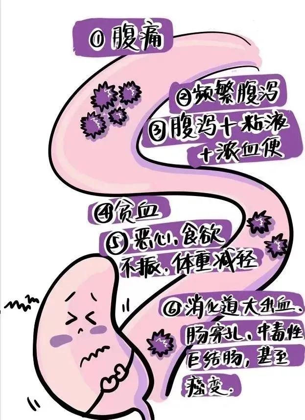 溃疡性结肠炎的特点是病变往往是从直肠开始发展,局限于结肠,累及结肠的黏膜和黏膜下层,呈连续性炎症性变化,累及远段结肠,可逆行发展,病变一般以直肠最重。最常见临床表现为持续或反复发作的腹泻、黏液脓血便伴腹痛、里急后重(就是常常想排便,但是去到卫生间排除很少的大便或没有)和不同程度的全身症状,病程多在4-6周以上。